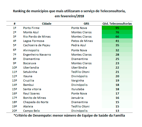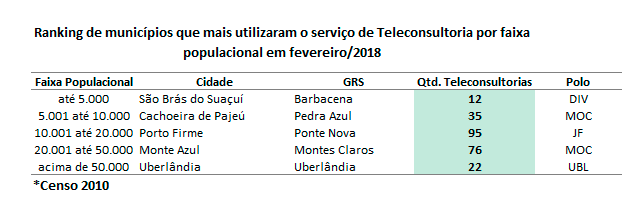 O Centro de Telessaúde e a Rede de Telelessaúde de Minas Gerais emitiram em fevereiro de 2018 o total de 25.967 laudos de eletrocardiogramas, 94 laudos de Holter, 20 laudos de MAPA e responderam 943 teleconsultorias, gerando uma economia de R$ 1.537.333,31 pela redução de encaminhamentos. As pesquisas de satisfação respondidas, em fevereiro de 2018, apontam que 94% dos usuários declararam-se satisfeitos com as respostas obtidas pelas teleconsultorias. A pesquisa apontou também que dos atendimentos realizados, em 73% dos casos evitou-se o encaminhamento dos pacientes a outros níveis de atenção com o uso do sistema de teleconsultoria.